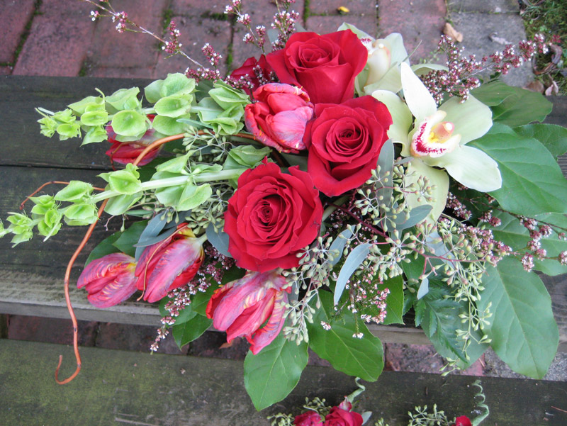 A gathering of flowers not for the faint at heart, designed with passion and intensity to grace any table. A great collection of chartreuse and red assorted flowers to wow the senses and send a floral message of magnificence to that special person in your life.